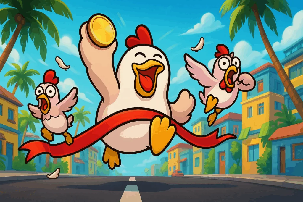 Es un juego de tipo crash donde ves a un pollito corriendo por una calle con tráfico. Tu objetivo es retirar tu dinero antes de que el pollito sufra un accidente, ganando según el número que veas en ese momento.
